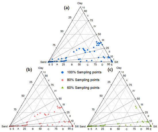 The Flemming Triangle Diagram under Different Numbers of Sample Points: (a) The blue hexagons represent the distribution of the original sampling points, serving as the control group. (b) The red dots indicate the distribution of 80% of the sampling points. (c) The green triangles show the distribution of 60% of the sampling points.