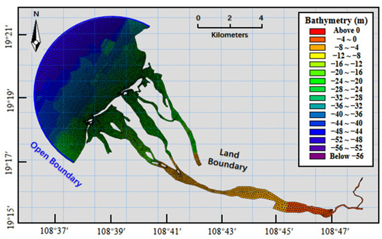 An unstructured grid, finite volume, regional ocean model FVCOM [45] was used to simulate the hydrodynamic background and hydrological features. It has been widely used for the study of coastal oceanic and estuarine circulation [46,47,48]. To enhance computational accuracy and reduce computation time, the density of boundary nodes gradually decreases from nearshore to offshore. In the offshore region, the grid density is lower, with a resolution of 0.2 km, while the nearshore part of the open boundary has a higher grid resolution. In the main research area near the river channel, the grid resolution is highest, reaching 50 m. The entire study area grid comprises a total of 25,921 computational nodes (Figure 5). Since the primary focus is on the surface-related hydrodynamic information, the vertical dimension is discretized into five layers. The hydrodynamic model used in this study has been previously validated for its ability to simulate current velocity and direction [49]. In that work, we compared the model outputs with in situ measurements and found a high degree of correspondence, confirming the reliability of the model for our region of interest.