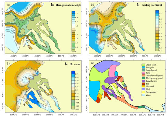 (a) Spatial distributions of the mean diameter of the surface sediment. (b) Spatial distributions of the sorting coefficient. (c) Spatial distributions of the skewness. (d) Spatial distributions of the sediment types in the study area.