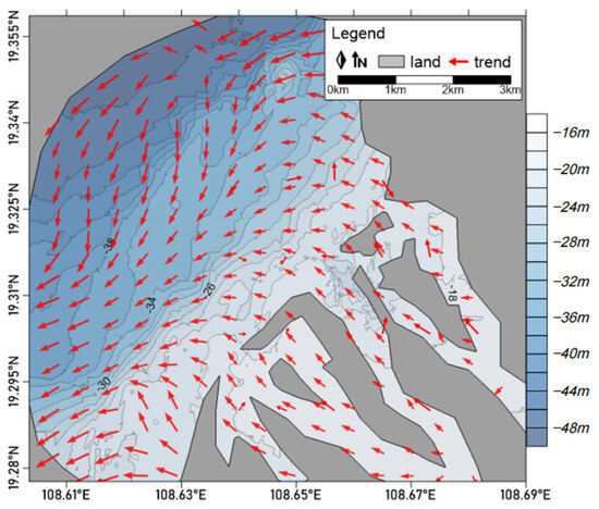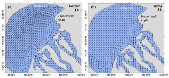 There are two vortices in the residual current of the study area, a large counterclockwise vortex in the middle nearshore area, and a small counterclockwise vortex in the southern area. The residual current near the shore flows northeastward, deflects after passing below the topped wall angle, and changes to west–southwestward, moving together with the northwestward residual current from the Beibu Gulf [38]. Most of the residual currents in the far sea are southward and southwestward, and the residual current directions in the river channels all point to the ocean.