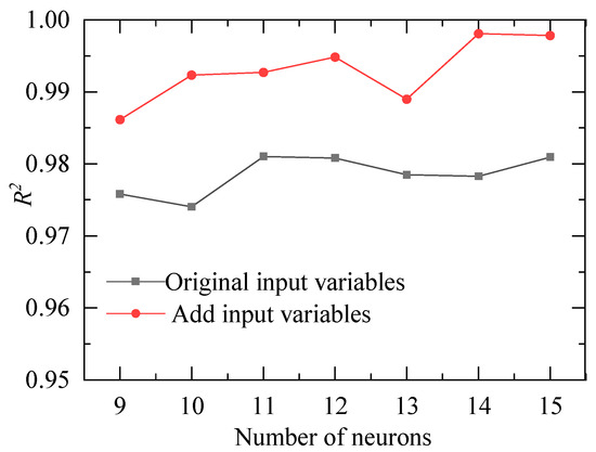 The number of neurons in the hidden layer of the network model was taken as 9, 10, 11, 12, 13, 14, and 15, respectively, and the approximation accuracy of the network was measured by the correlation coefficient