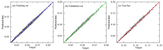 Figure 3b, showing that the prediction accuracy of the network model has been greatly improved and can be used for propeller performance prediction and optimization design. In summary, through adjusting and training the network model, the numbers of neurons in the input layer, hidden layer, and output layer of the BP network are finally determined to be 6, 14, and 1, respectively.