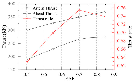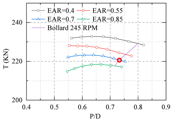 Figure 12, it can be seen that as the expanded area ratio increases, both the astern and ahead thrust show an increasing trend, but the thrust ratio first increases and then decreases, reaching a maximum at an expanded area ratio of 0.7. Therefore, the expanded area ratio of the preliminary propeller design scheme is determined to be 0.7, and the thrust ratio is about 0.76, meeting the design requirements. After determining the propeller expanded area ratio of 0.7, the pitch ratio can be determined as 0.73 (red circle in the figure, and represents the intersection of both the reverse thrust requirements and the forward hydrodynamic performance requirements) from the purple curve in