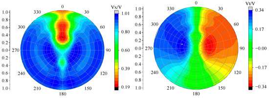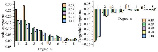 Figure 13 that the axial and tangential wake distributions behind the ship have symmetry, so the derivation of Equation (15) is reasonable. For the axial wake, the high-wake region is within about ±15° behind the ship, while for the tangential wake, the high-wake region ranges from about 15° to 135°, and 225° to 345°. The Fourier transform method is used to perform a harmonic analysis on the wake field to obtain the amplitude and phase angle of the wake components.