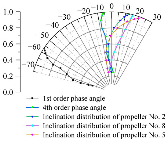 Figure 14 that the fourth-order wake phase angle has the same bias as the skew angles of propellers No. 2 and No. 5, reducing the intersection angle between them, while propeller no. 8 will increase the intersection angle between the two (the fourth-order wake phase angle and the skew distribution of propeller no. 8 are bolded in the figure, and the skew of propellers no. 2 and no. 5 falls within the interval). At the same time, the design of the blade skew should also be combined with the ship type, operating tasks, and requirements for further analysis to determine the final skew distribution. Therefore, this section refers to the conclusion in Ye [