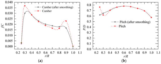 Figure 17 shows the results of the lifting surface cambered surface design. The dashed lines in the figure are the original design results. Since the Kerwin method sets the circulation at the hub to be non-zero, the blade pitch and circulation have inflection points at the blade root. Here, the camber and pitch distributions are smoothed, as shown by the solid lines in the figure.