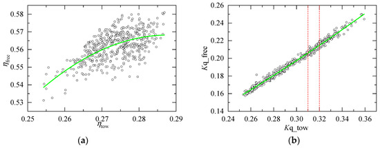 Figure 18 presents the results of 500 optimization designs, with the green curve representing the trend line. It can be seen that the propulsive efficiency of the optimized propeller under towing conditions is mainly between 0.265 and 0.285, while the efficiency under free-running conditions is roughly between 0.545 and 0.575. The schemes that meet the design requirements for towing conditions are within the red line range shown in