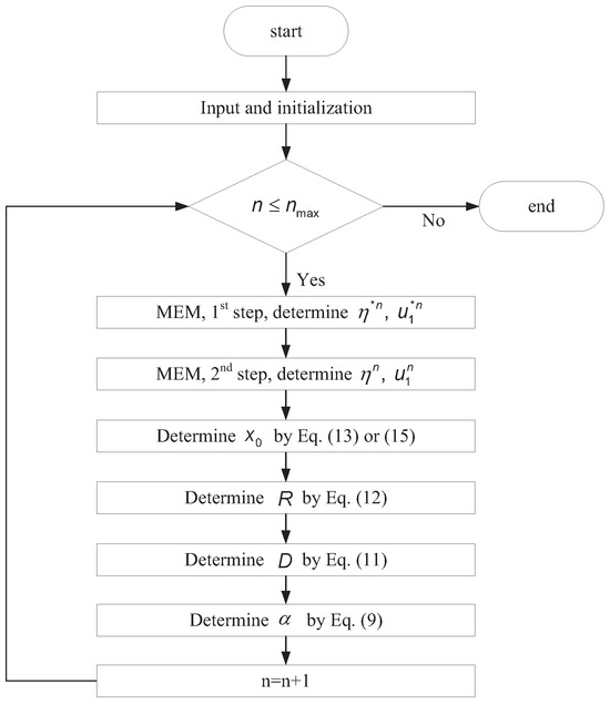 The two-step MEM calculation is first performed to obtain and . Then, , R and D are updated to determine . The process is repeated in each time step, and it continues for times. The workflow of the numerical procedure of the GN model is shown in Figure 2.