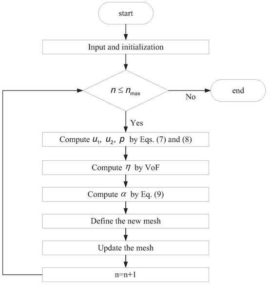 The flowchart of the numerical procedure of the NS model is presented in Figure 3. The velocity and pressure fields are obtained in each time step. The surface elevation between the air and water phases are obtained by the use of the VoF method. The oscillations of the bottom disturbance are updated and the mesh deformations on the bottom are found by the mesh morphing approach. Thus, new mesh points are updated over the entire domain.