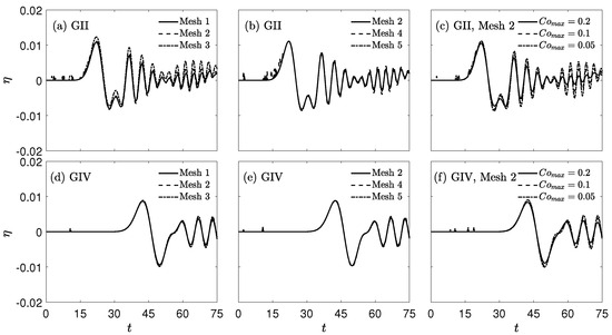 Comparisons of the time series of wave elevation at (a–c) GII and (d–f) GIV for Mesh 1, Mesh 2 and Mesh 3 (subplot (a,d)), Mesh 2, Mesh 4 and Mesh 5 (subplot (b,e)), and different values of , namely, , and (subplot (c,f)) with Mesh 2, for waves generated by a single motion of the bottom disturbance.