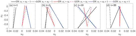 We recall that, in the Level I GN equations in this study, is distributed linearly in the vertical direction. Thus, from Equations (27) and (28), i.e., velocities at the bottom and top surfaces of the fluid sheet, we can define the distribution of along the water column. Figure 5 shows the vertical distributions of at the trailing edge of the bottom disturbance, center and the leading edge of the bottom disturbance by the GN and LGN models for , , and . Shown in Figure 5, we observe different slopes at the trailing edge, center and leading edge of the bottom disturbance in the vertical direction at different times.