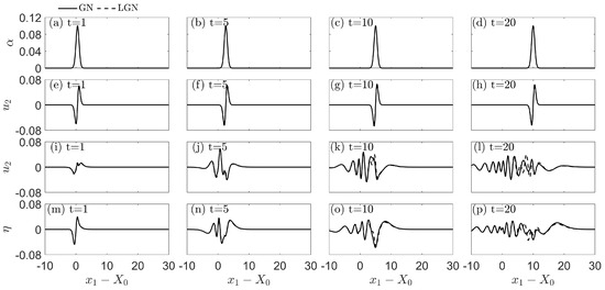 Snapshots of (a–d) , (e–h) on the bottom seafloor, , (i–l) on the free surface, and (m–p) wave surface elevation at different times by the GN and LGN models for , , and .