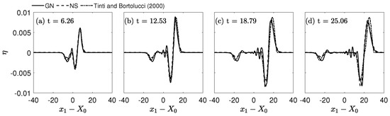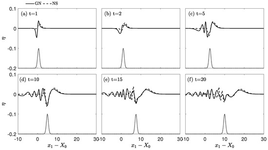 This case is studied here by use of the GN and NS models and for the following conditions: , , and . The snapshots of surface elevation at different times obtained by the two models and the results of [17] are shown in Figure 7. Figure 7 shows that two waves are generated due to the motion of the bottom disturbance: one wave with a distinguished peak and trough propagates in the same direction as the moving bottom, although a single depression propagates in the opposite direction. We find that the following tail waves are formed by the nonlinear models, which are omitted in the linearized model in [17]. Those tail waves due to nonlinearity modulate the leading waves and affect wave evolution: the peak and trough obtained by the two models propagate slightly more slowly than that in [17]. Overall, quite good agreement can be found between the two models and the results in [17]. The GN and NS models show closer agreement with each other.
