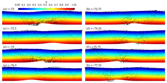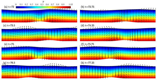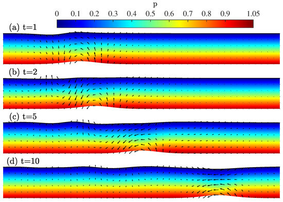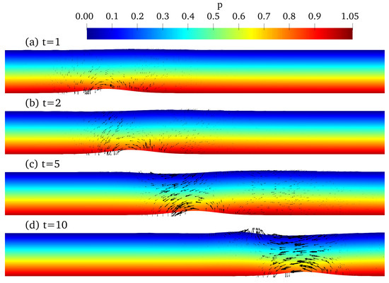 In this section, the evolution of the pressure and velocity fields are presented and discussed for the case of , , and . The snapshots of the pressure and velocity vector fields at , , and obtained by the NS and GN models are shown in Figure 8 and Figure 9, respectively.