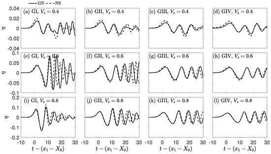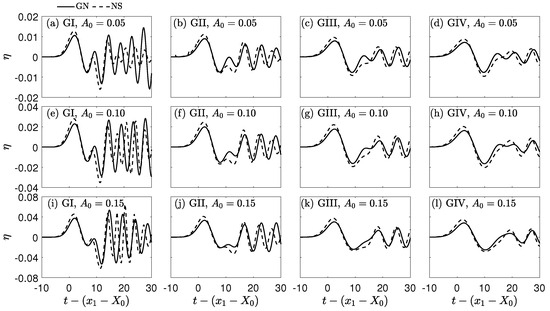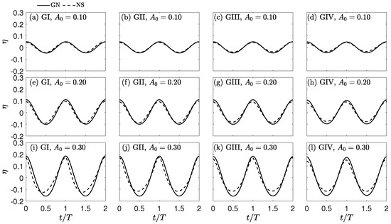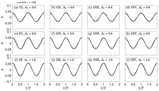 The waves generated vary with the oscillation amplitude, and this is studied in this section. The time histories of wave elevation for , and and , and are shown in Figure 20. Stable, periodic waves are generated by the oscillatory motion of the bottom disturbance. Slight differences between the two models are found for different . The two models agree very well on surface-elevation upwave calculations.