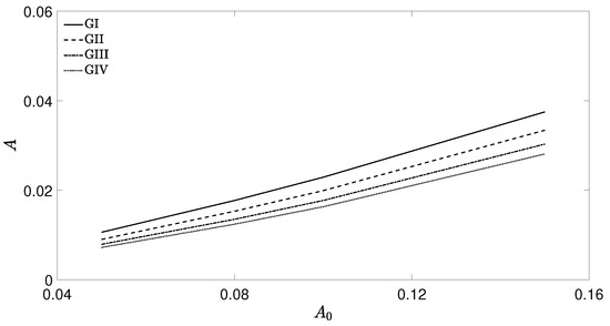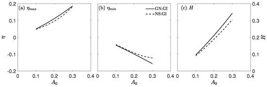 The variation of , and H with for Gauge GI is shown in Figure 21. Shown in the figure, and vary nonlinearly with in all cases. It is observed that has a positive effect on H, i.e., H increases with increasing and this is nonlinear. We find that the and the absolute value of are increasing for larger , i.e., waves generated have larger wave heights when the bottom disturbance oscillates with longer distance.