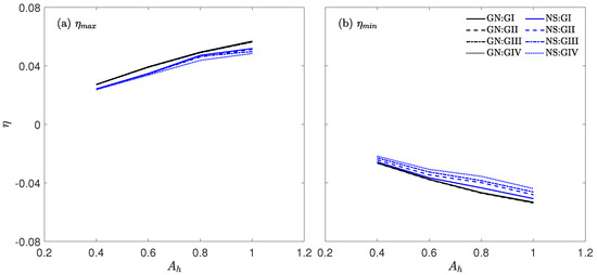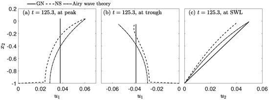 where and are the exact kinematic boundary conditions on the bottom and the free surface, respectively, for the LGN model. From Equation (28), if . Equation (28) confirms explicitly that the wave surface elevation is deformed due to the vertical momentum around the free surface.