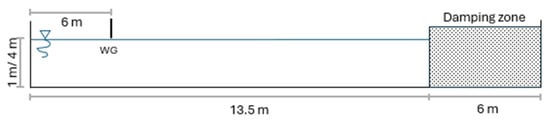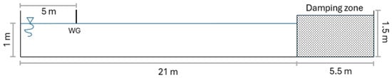 To conduct this study, a two-dimensional wave tank is set up with specific parameters to facilitate a detailed analysis of wave behavior under varying conditions. The tank is 19.5 m in length and features water depths of 1 m and 4 m. It is designed to generate second-order Stokes waves with wave heights H of 0.16 m and 0.3 m, and a wave period T of 2 s, as illustrated in Figure 1. This numerical wave tank configuration is utilized to simulate wave propagation, incorporating a damping zone and a piston mechanism as the wavemaker.