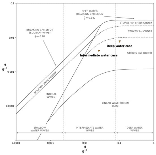Simulations were conducted under non-breaking wave conditions for both deep and intermediate water depths, where wave deformation is less affected by water depth. As illustrated in Figure 2, which shows the wave condition and detailed wave parameters in Table 1, two cases were selected to evaluate the wave-making performance of the DualSPHysics model. Case 1 focused on deep water conditions with relatively high wave steepness, while Case 2 examined intermediate water depths, where the wave steepness was lower. These cases were chosen to investigate how particle resolution in the SPH model responds to changes in wave steepness under different hydrodynamic scenarios.