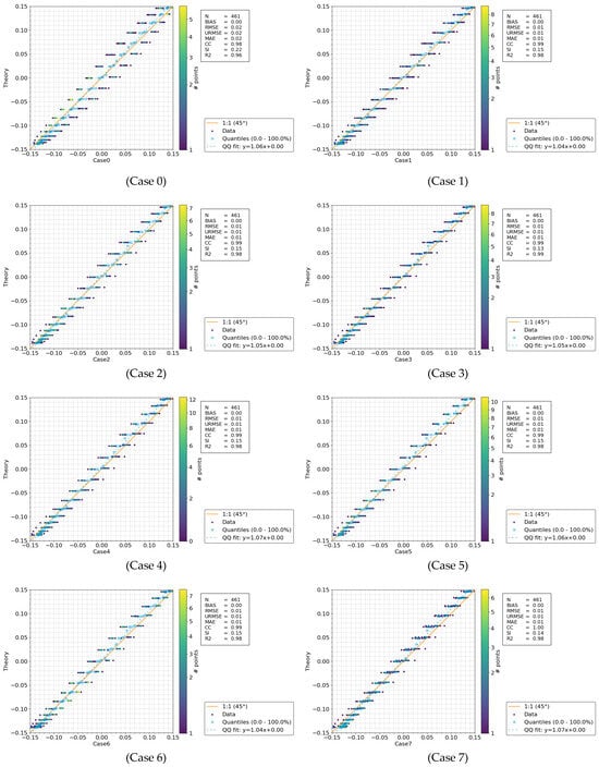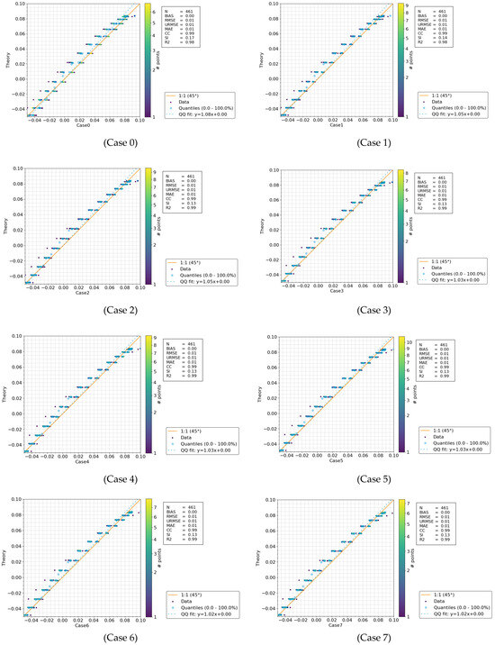 Table 6 and the scatter plot in Figure 5 illustrate the wave elevations over time, benchmarked against the theoretical second-order Stokes wave solution. Cases 10 and 11 are the top-performing simulations across a range of metrics, including RMSE, URMSE, MAE, CC, SI, and R2. They strike a strong balance between low bias, high accuracy, and excellent correlation with the observed data. Cases 8 and 9 also demonstrate solid performance, particularly in RMSE and CC, making them viable alternatives, especially if computational constraints or other considerations arise. Although Case 0 exhibits the highest bias and RMSE, suggesting lower accuracy, its strong SI and R2 values indicate that the model still accounts for most of the variance in the data.