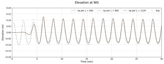 In this test, particle number densities of 560 to 1120 particles per unit length (np per L) were employed to assess the accuracy and efficiency of the simulation. This configuration resulted in a total of 34,284 particles for np per L = 560, 677,052 particles for np per L = 800, and 1,322,574 particles for np per L = 1120. The time series of wave elevation, as depicted in Figure 8, demonstrates that the numerical simulation closely aligns with the experimental data for all particle density cases, thereby confirming the validity of the selected particle number densities. Notably, np per L = 1120 exhibited slightly better accuracy compared to np per L = 800 and 560, as shown in Table 8 and a scatter plot in Figure 9.