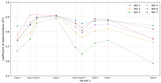 Figure 11 illustrates the coefficient of determination (R2) for six different elevations at WG2 to WG7 across the simulation cases. WG2 consistently achieves the highest R2 values, reflecting superior model accuracy, while WG4 experiences significant fluctuations, with noticeable drops in R2 particularly in Case 4 and Case 8. Most R2 values at WG2 to WG7 show their peak accuracy around Case 3, suggesting optimal model performance at this range.