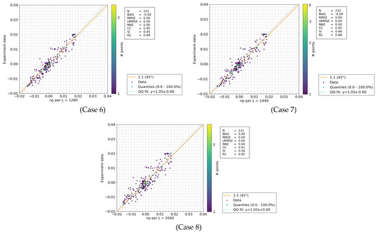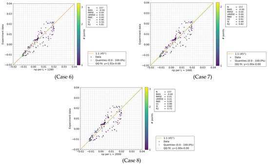 In Figure 23, wave elevations at two wave gauges (WG1 and WG2) reveal a complex relationship between particle resolution (np per L) and model accuracy, as evidenced by the correlation coefficients. At WG1, increasing particle resolution generally results in higher bias and error metrics (RMSE, URMSE, and MAE), while simultaneously reducing the correlation coefficient (CC) and the coefficient of determination (R2). This trend suggests that beyond a certain threshold of resolution, the simulation may experience overfitting or the introduction of additional discrepancies, ultimately degrading the model’s performance. A similar pattern is observed at WG2, where higher particle resolutions are associated with increased bias and error, with the lowest correlation and highest scatter index occurring at np per L = 2000. Notably, RMSE and URMSE values are consistently higher at WG2 compared to WG1, highlighting the greater challenge of accurately modeling wave dynamics over longer distances. These findings suggest that, while higher resolution may improve spatial granularity, it does not necessarily enhance model accuracy and may introduce computational inefficiencies without corresponding improvements in predictive performance. Detailed results are provided in Table 12 and the scatter plots in Figure 24 and Figure 25.