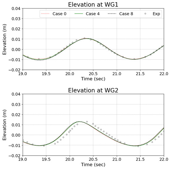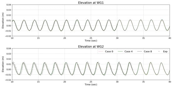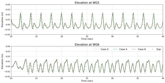 Figure 14, Figure 15, Figure 16, Figure 17, Figure 18, Figure 19, Figure 20 and Figure 21 present a comparison between the elevation profiles of simulation data and experimental data, focusing on the wave shape from different gate WGs. The plots highlight how well the simulation results align with experimental observations by analyzing wave elevation over time. The elevation profiles for WG3 through WG7 present a comprehensive comparison between simulation data for multiple cases (Case 0, Case 4, Case 8) and experimental data. WG3 and WG4, situated in the breaking zone, show strong agreement between the simulation results and experimental data, with well-aligned wave peaks and troughs, although minor discrepancies are noticeable near the crests and troughs. The simulations effectively replicate the wave dynamics in these high-turbulence environments, with consistent performance across the different cases. In WG5, WG6, and WG7, which represent post-breaking zones, the simulation data also closely match the experimental observations. The agreement between the simulation and experimental results across WG1 to WG7 demonstrates the robustness of the model in simulating wave dynamics across different zones, from the non-breaking zones to the breaking zones. The results indicate that the model is capable of accurately predicting wave behavior in varying conditions, maintaining reliable performance throughout different wave zones.