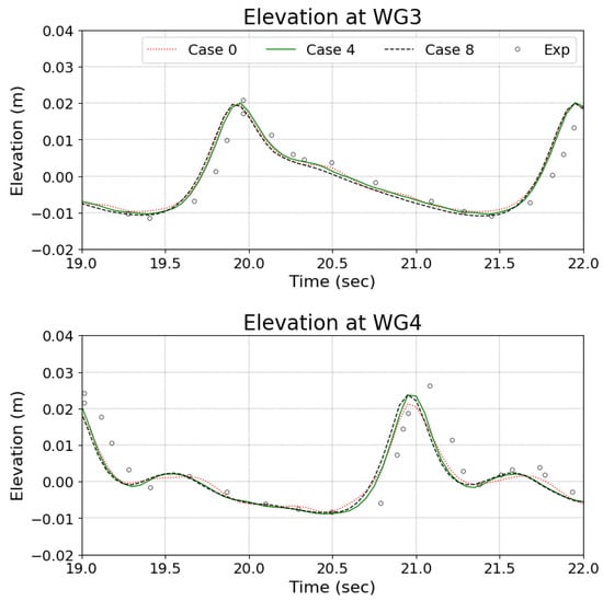 Elevation data at WG3 and WG4 were compared with the experimental data.