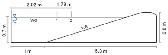 The simulations are conducted in a two-dimensional (2D) setting, capturing the dynamics of water waves. The experimental setup is described in detail in the original paper by Beji and Battjes [19], as shown in Figure 10. A submerged trapezoidal bar was constructed, consisting of an upslope of 1:20 and a 2 m horizontal crest followed by a 1:10 downslope. The height of the horizontal plane section was 0.3 m above the bottom of the flume, at the end of the flume opposite the wave generator, a plane beach with a 1:25 slope. The simulation cases are outlined in Table 9, with a wave height of 0.02 m and a wave period of 2.02 s as wave conditions.