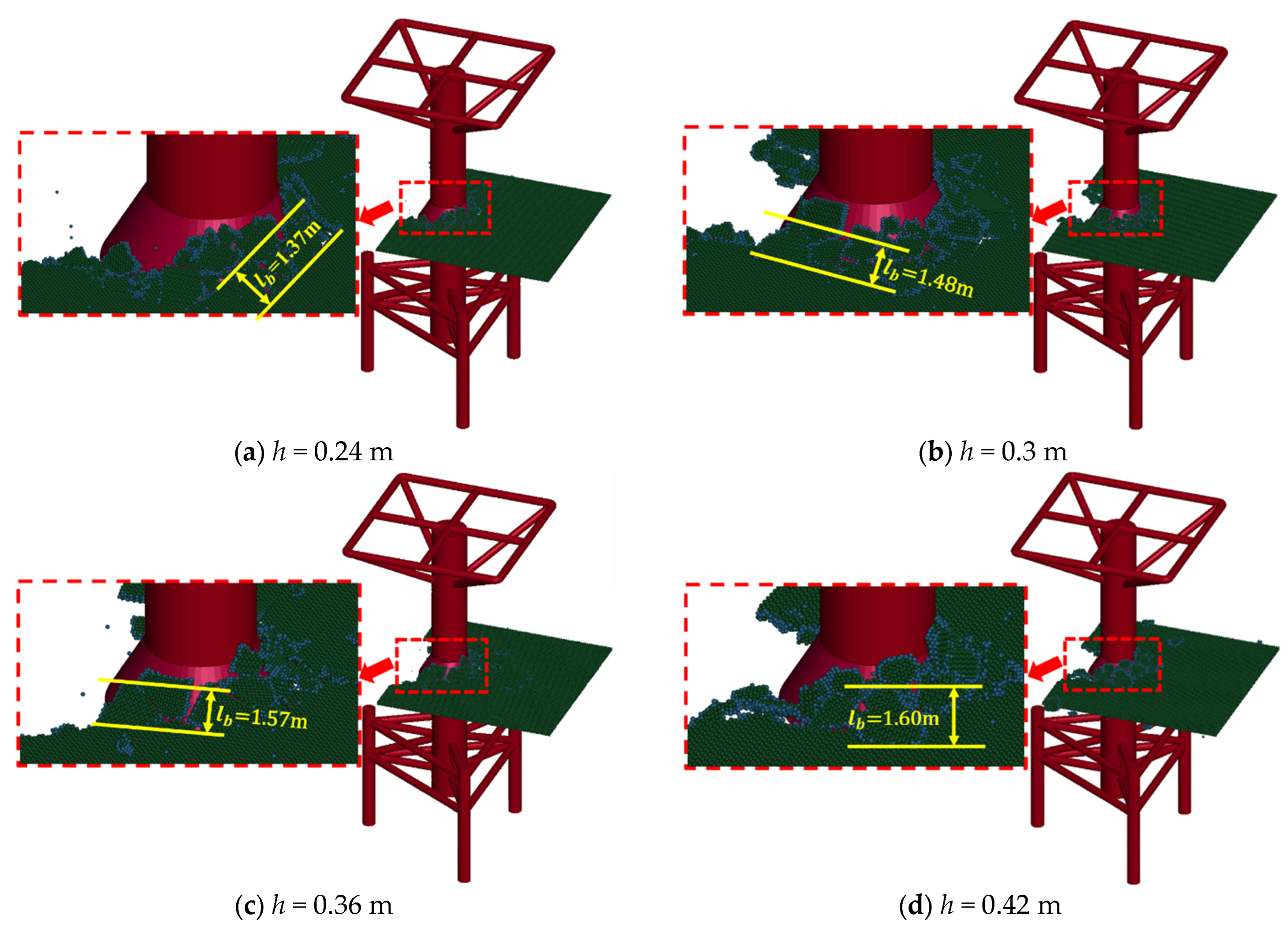 - Di, S.; Xue, Y.; Wang, Q.; Bai, X. Discrete element simulation of ice loads on narrow conical structures. Ocean Eng. 2017, 146, 282–297. [Google Scholar] [CrossRef]