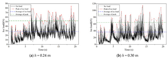 Figure 7 presents the time-history curves of ice loads for various ice thickness conditions. Statistical analyses of the simulated ice loads focused on their average and peak values. The trends observed in these time-history curves clearly reveal that the ice load on the conical structure displays considerable randomness and periodicity, closely matching the findings from field observations.