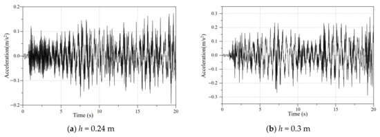 The time-history curves of ice-induced vibration acceleration for the platform at varying ice thicknesses are shown in Figure 10. These curves reveal a distinct periodicity in the ice-induced vibration acceleration. Specifically, with increasing ice thickness, the acceleration range evolves from an initial −0.2 m/s2 to 0.2 m/s2, extending to a range of −0.6 m/s2 to 0.6 m/s2, accompanied by a significant rise in the peak acceleration.