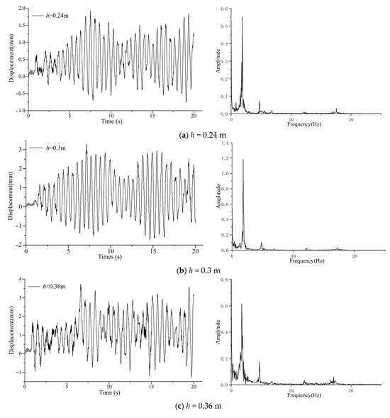 To further investigate the ice-induced structural response of the JZ20-2NW platform, the time-history curves of structural displacement under different ice thickness conditions were obtained, and the time series of ice force was transformed by fast Fourier transform (FFT). The results of the displacement and the frequency spectrum are shown in Figure 12. Ice thickness has a significant impact on the displacement of the jack-up platform, influencing its stability and operational performance. Notably, the upward displacement in the positive direction exhibits a clear increasing trend as ice thickness rises, indicating a direct correlation between the two variables; this change is quite pronounced and suggests that thicker ice may lead to greater upward forces acting on the platform. In contrast, the displacement in the negative direction shows minimal variation with changes in ice thickness, consistently remaining around −1.5 mm, which implies that the platform’s response to downward forces remains relatively stable regardless of the ice conditions.