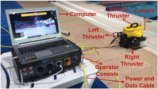 In this study, the remotely operated underwater vehicle (ROV) that will be endowed with autonomous features consists of a user computer, an operator console, and cable section. The unmanned underwater vehicle is equipped with two forward thrusters, one on the left and one on the right, a vertical thruster, and a camera that can rotate 180 degrees. The forward thrusters provide forward movement and yaw orientation, while the vertical thruster provides diving movement. The operator console is used for controlling the vehicle and transferring the data obtained from the vehicle to the computer. The cable ensures data and power transmission between the underwater vehicle and the operator console. In this study, the experimental equipment used in the pool experiment is presented in Figure 1 [59].