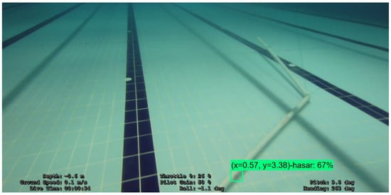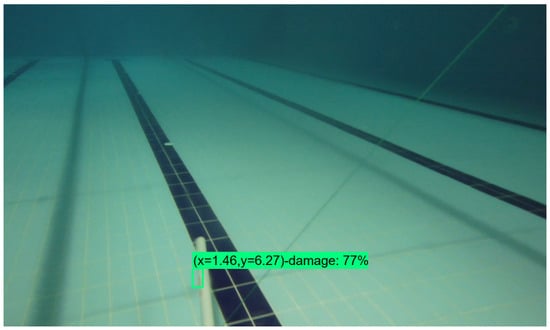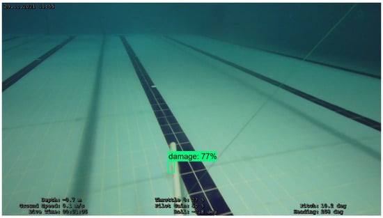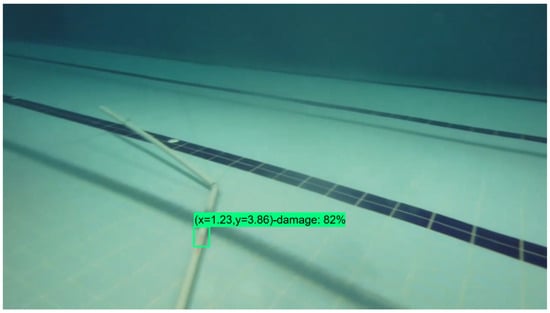 Using the CNN algorithm, damages on the underwater pipeline in a pool environment were diagnosed online using an unmanned underwater vehicle. The damage diagnosis results are presented in Figure 4. Although the damaged section on the underwater pipeline is very small, it was successfully detected using the CNN algorithm. The accuracy of detection in the pool environment can vary depending on lighting conditions, light refraction, reflections, and glare. In the pool, light usually comes from artificial sources and provides more homogeneous illumination. The reflections created by artificial lights on the water surface or direct entry of light into the water can cause glare or shadows in the image, making it difficult for the CNN algorithm to accurately recognize objects. Due to light refraction, objects may appear different from their actual form, further complicating the algorithm’s ability to identify them correctly. As seen from in the Figure 4, the unmanned underwater vehicle has been endowed with the ability to detect objects through the underwater damage detection test.
