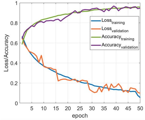 In Figure 5, the accuracy and loss curves of the CNN training are visible. The ESA training for damage diagnosis was carried out over 50 Epochs. An epoch means that the model sees each data in the dataset once. As seen in Figure 5, both the training loss and the validation/consistency loss have been observed to decrease, which is a desired outcome.