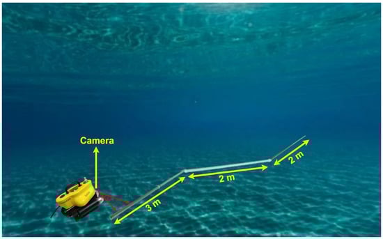 In this study, autonomous features were endowed to a remotely operated underwater vehicle, which was then used for underwater pipeline tracking in a pool environment, and damage detection on the pipe as well as the location of this damage were achieved. In the experiment, a schematic representation of the scenario created for the underwater pipeline and images from the pool experiment are given in Figure 6 and Figure 7. As seen in Figure 6, during the experiment, an underwater pipeline was created inside the pool using one 3-m and two 2-m pipes.