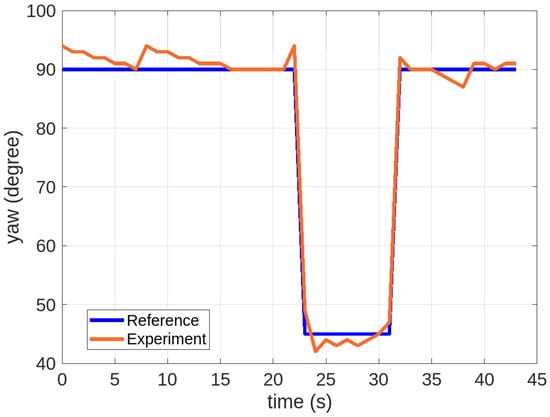 Reference yaw angle (blue line) and measured yaw angle (red line).