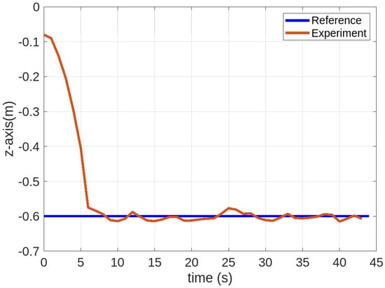 Figure 11 presents the depth information of the vehicle. In this experiment, the pipeline was placed at a depth of 1.8 m in the pool. To follow the pipeline from above at this depth, the unmanned underwater vehicle was submerged to a depth of 60 cm in the pool. Figure 10 presents the changes in the yaw angle made by the vehicle while following the pipeline. Initially, the vehicle followed the 3-m section of the pipeline at a 90-degree deviation angle in about 22 s (including 6 s of submersion time), the 2-m section at a 45-degree angle in 10 s, and the final 2-m section again at a 90-degree angle in 10 s.