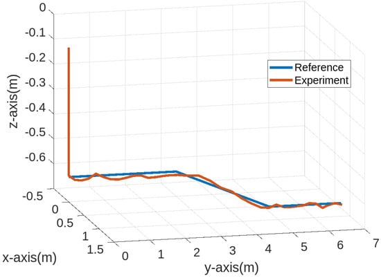 In Figure 15, the 3D movement of the unmanned underwater vehicle during the autonomous underwater pipeline tracking experiment are presented, respectively. The pipeline that was intended to be followed is shown as a blue line as the reference path (the known pipeline length is the actual data), and the path the vehicle followed during the experiment is shown as a red line (measured comes from navigation of the vehicle). As can be seen from Figure 15, the vehicle successfully followed the pipeline placed in the pool with high performance.
