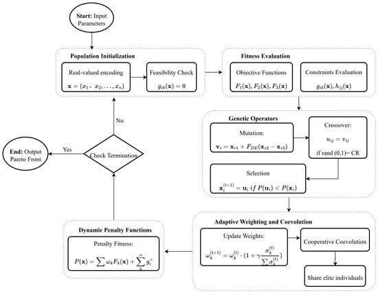 Cooperative coevolutionary algorithms (CCEAs) divide complex optimization problems into subcomponents that evolve concurrently, enhancing the scalability and efficiency of the optimization process. Potter and De Jong [22] introduced the architecture for evolving coadapted subcomponents, laying the foundation for CCEAs. Yang and Tang [23] applied cooperative coevolution to large-scale evolutionary optimization, demonstrating its effectiveness in handling high-dimensional problems. Gong et al. [24] proposed a hybrid differential evolution with biogeography-based optimization for global numerical optimization, showcasing the potential of combining CCEAs with other evolutionary strategies. Omidvar et al. [25] introduced cooperative co-evolution with differential grouping for large-scale optimization, improving the decomposition strategies within CCEAs. Zheng et al. [26] developed a cooperative coevolutionary algorithm for multiobjective optimization, extending the application of CCEAs to problems with multiple conflicting objectives. Xu et al. [27] addressed multi-objective optimization problems with changing decision variables using CCEAs, highlighting the adaptability of these algorithms to dynamic environments. Peng et al. [28] presented a dynamic optimization approach to the design of CCEAs, focusing on improving performance over time. Ma et al. [29] provided a survey on cooperative co-evolutionary algorithms, summarizing advancements and applications in the field. Tan et al. [30] proposed a distributed cooperative coevolutionary algorithm for multiobjective optimization, enhancing computational efficiency. Zhou et al. [31] introduced a multi-strategy competitive–cooperative co-evolutionary algorithm and its application, further advancing the methodology of CCEAs.