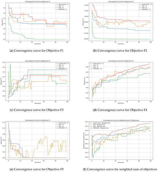 Convergence curves for different objectives across multiple algorithms. (a) Objective F1, (b) Objective F2, (c) Objective F3, (d) Objective F4, (e) Objective F5, (f) weighted sum of objectives.