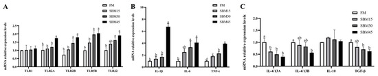 The utilization of soybean meal as a dietary component resulted in a significant boost in the mRNA levels of Toll-like receptors (TLRs) (p < 0.05), specifically TLR2A, TLR2B, TLR5B, and TLR22 (Figure 1A). These elevations exhibited a positive correlation with the rising concentration of soybean meal in the diet. Specifically, the TLR2B, TLR5B, and TLR22 expression levels were significantly augmented in the SBM30 and SBM45 treatments compared to the FM treatment (p < 0.05). Analogously, the TLR2A expression level showed a substantial upregulation in the SBM45 treatment, surpassing all other treatment groups (p < 0.05). However, the TLR1 expression level remained statistically unchanged across all treatment groups (p > 0.05).