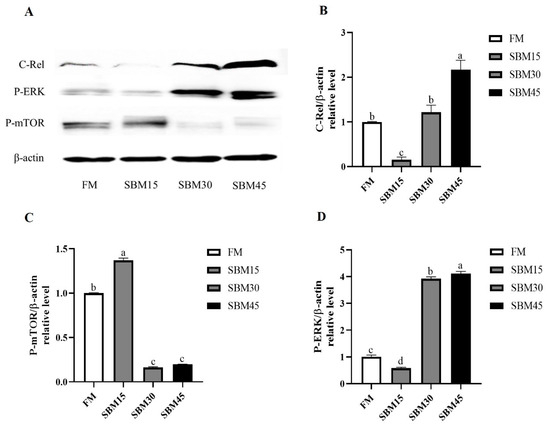 Upon comparison with the FM treatment, the protein level of Recombinant Human C-REL (C-Rel) exhibited a notable boost in the SBM45 treatment (p < 0.05), whereas a significant decrease was observed in the SBM15 treatment (p < 0.05) (Figure 2A,B). Similarly, when assessed against the FM treatment, the SBM30 and SBM45 treatments displayed a significant elevation in the phosphorylation level of extracellular-regulated protein kinases (ERKs) (p < 0.05), whereas the SBM15 treatment showed a marked decrease in the same parameter (p < 0.05) (Figure 2A,D). Furthermore, the Mammalian Target of Rapamycin (mTOR) phosphorylation levels in the SBM30 and SBM45 treatments exhibited a marked decrease, significantly lower than those observed in the FM treatment (p < 0.05) (Figure 2A,C). However, in contrast to the FM treatment, the mTOR phosphorylation level in the SBM15 treatment showed a significant elevation (p < 0.05).