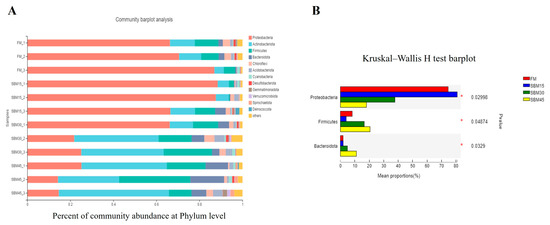 Subsequently, the V3–V4 hypervariable segment of the bacterial 16S rRNA gene underwent amplification via the polymerase chain reaction (PCR), adhering strictly to the amplification protocol outlined by Zhang et al. [13]. The resulting PCR products were then purified in accordance with a previously described protocol outlined by Wang et al. [14]. Following purification, the DNA samples underwent paired-end sequencing on the Illumina MiSeq platform, with technical support provided by Majorbio bio-pharma Technology Co., Ltd. (Shanghai, China). The raw sequencing data obtained were subsequently processed and analyzed in accordance with the established and standardized procedures described by Wang et al. [14]. Using the Kruskal–Wallis H test and one-way analysis of variance (ANOVA), the abundance differences in gut microbiota between different treatments, in terms of phylum and genus classifications, were examined, with a significance threshold of p < 0.05.