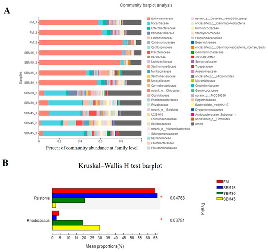 In this study, the ACE, Chao1, and Shannon indices were employed to assess the richness of species within the gut microbiota. The results revealed no discernible differences in the indices across the various treatment groups (p > 0.05) (Table 6). The soybean meal treatments did not significantly alter the α-diversity of the gut microbiota in L. crocea. However, at the phylum and genus levels, the soybean meal treatments did induce changes in the composition of certain bacterial communities within the intestine of L. crocea. Specifically, Proteobacteria, Actinobacteria, Firmicutes, and Bacteroidota were prominently abundant across all four treatments, accounting for 50.58%, 19.73%, 12.66%, and 5.07%, respectively, at the phylum level. Based on these findings, it is reasonable to postulate that these bacterial phyla occupy a dominant position within the gut microbiota of the L. crocea (Figure 3A). A thorough comparative analysis of the microbial community composition at the phylum level unveiled a notable decrease in the abundance of Proteobacteria in the SBM30 and SBM45 treatments. These treatments exhibited statistically significant lower levels of Proteobacteria compared to both the FM and SBM15 treatments (p < 0.05), as depicted in Figure 3B. Conversely, the abundances of Firmicutes and Bacteroidota were observed to be significantly increased in the SBM30 and SBM45 treatments when compared to the FM and SBM15 treatments (p < 0.05) (Figure 3B). On the genus-specific level, Ralstonia and Rhodococcus emerge as the predominant bacterial genera within the gut microbiota of L. crocea, exhibiting relative abundances of 40.63% and 12.76% accordingly (Figure 4A). Further, upon a comparative analysis of the genus-level composition of the microbial community, it became evident that the relative presence of Ralstonia in the SBM30 and SBM45 treatments was conspicuously lower compared to that observed in the FM and SBM15 treatments (p < 0.05). In contrast, Rhodococcus displayed a markedly elevated abundance in the SBM30 and SBM45 treatments, significantly surpassing that in the FM and SBM15 treatments (p < 0.05) (Figure 4B).