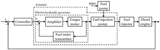 In Figure 2, , and represent the controller output, actuator output, and diesel engine rotational speed, respectively. The represent the transfer functions of the actuator and the DE, respectively.