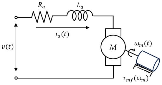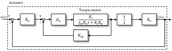 The actuator is simplified and modeled as a torque motor connected to a ball screw. First, the electrical circuit related to the torque motor can be represented as shown in Figure 3, where the input voltage results in angular velocity as the output.