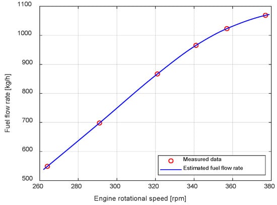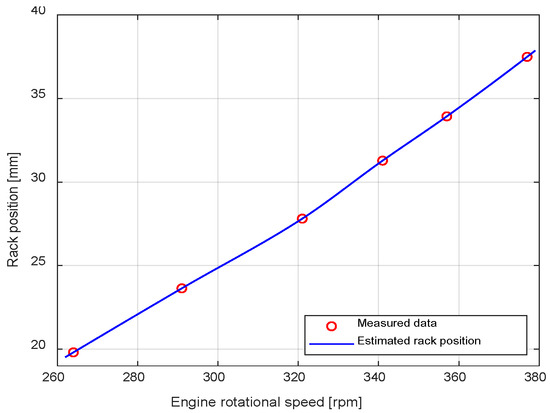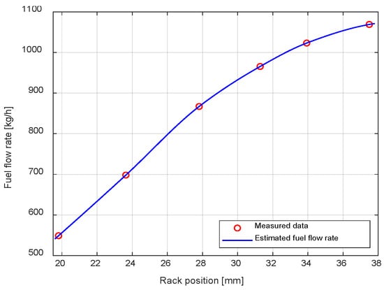 The right side of Equation (10) represents a highly complex nonlinearity to the position of the fuel rack, which determines the fuel flow rate and the engine’s rotational speed. Therefore, it is treated as a nonlinear function of these variables. By converting the engine’s angular velocity to the engine’s revolutions per minute , it can be expressed as